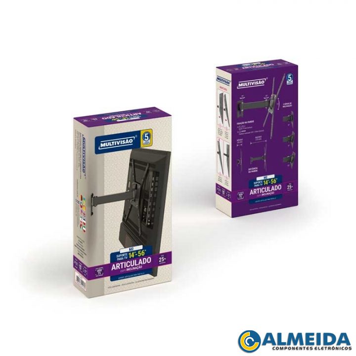 SOBRE O PRODUTO: O suporte M2 de parede articulado com inclinaзo й compatнvel com TVs de tela fina de 14” a 56”. O sistema de encaixe da TV no suporte facilita e permite que a instalaзo seja realizada por apenas uma pessoa com facilidade, alйm de oferecer 3 nнveis diferentes de inclinaзo: 0°, 6° ou 15°. Recuado, a TV fica 6,5cm e pode articular atй 21,5cm da parede.